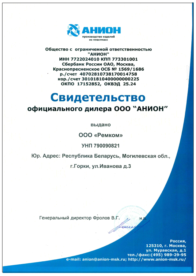 ООО "Ремком" является официальным представителем компании "Анион" (РФ) на территории Республики Беларусь. ООО "Анион" является одним из лидеров на российском рынке в сфере изготовления пласмассовых изделий методом ротационного формования, литья и экструзии и выпускает порядка двухсот наименований продукции: